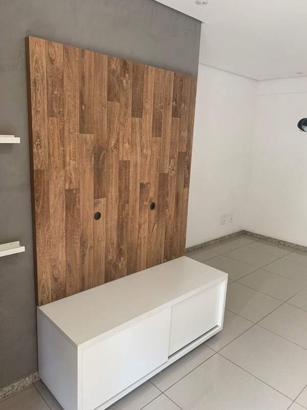 - 01 Sala com painel para televisão, decoração com espelhos;